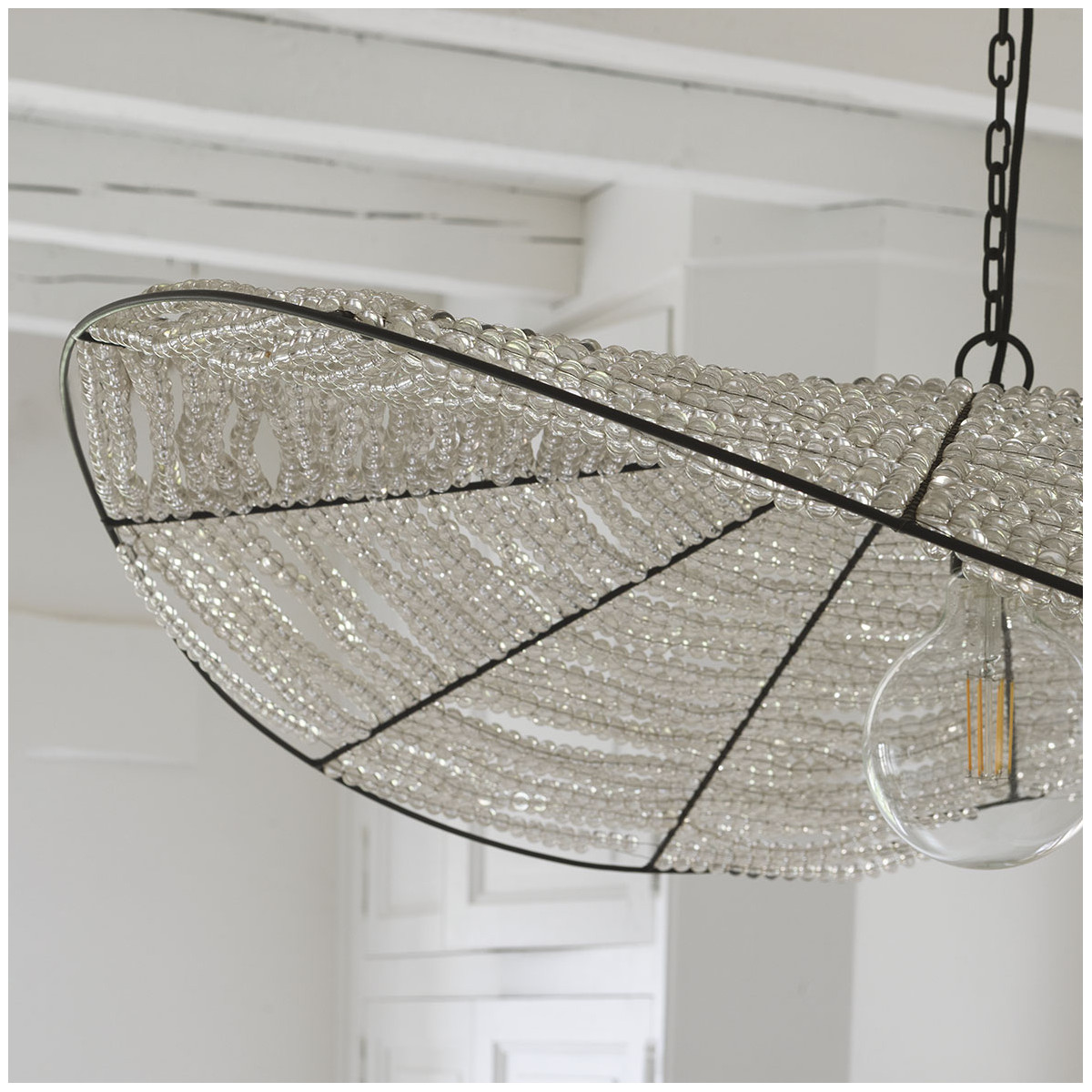Enhance your interior with the ALBA pendant light, adorned with beads delicately hand-placed. All lightness and refinement, its wire frame shape invites to travel and diffuses a soft and elegant light. A poetic lighting fixture that combines timeless elegance and singular charm.