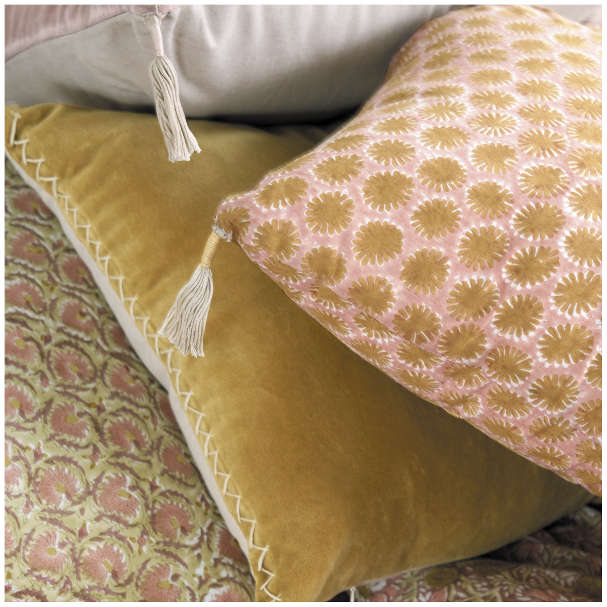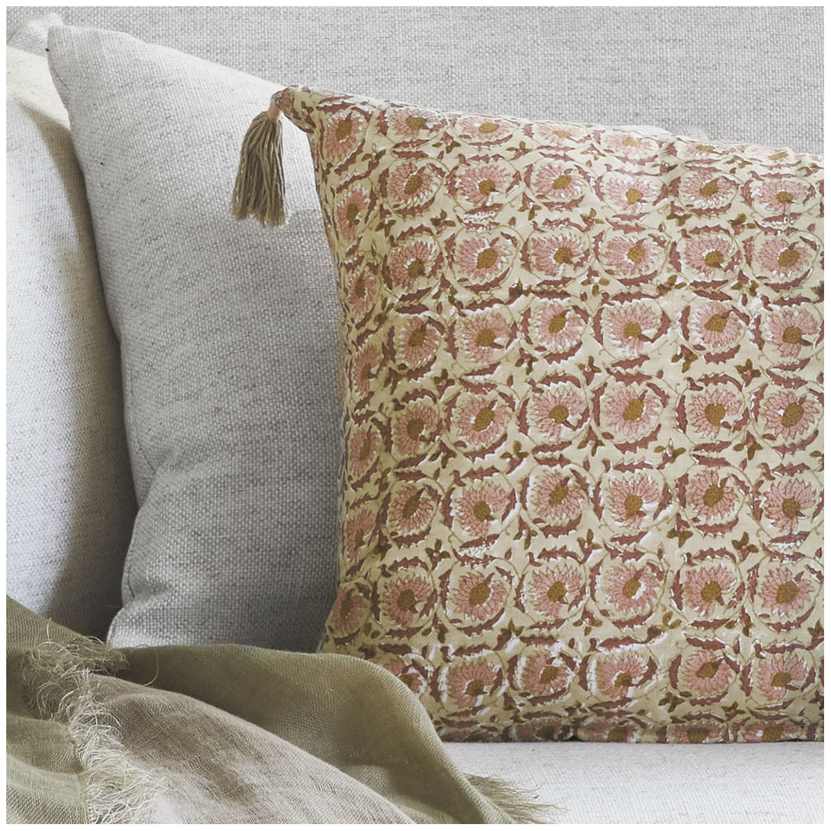The pink square FLORA cushion cover will seduce you with its colorful and romantic allure. It will find its place in all decorating styles with its pompoms and hand-stitched details. Play the contrast and originality card by pairing it with other sizes and mixing it with other colors or prints.