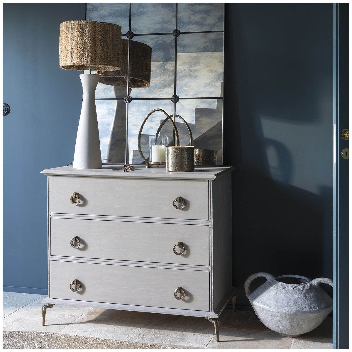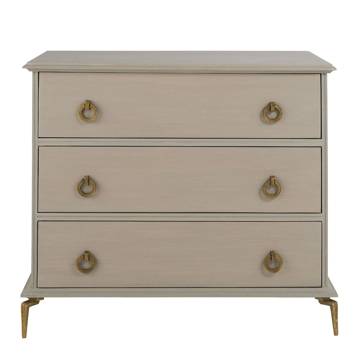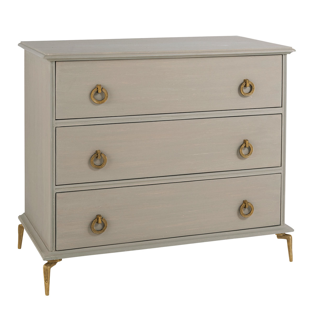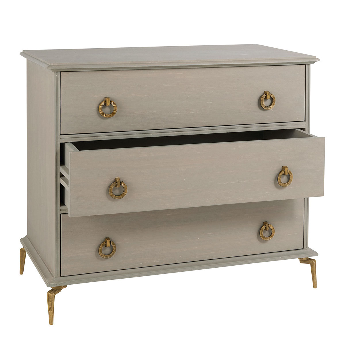 Entirely handcrafted, the classic curves of the GABRIELLE dresser in mango wood are enhanced by an artisanal gray patina and the luminous brass touches of its feet and handles.