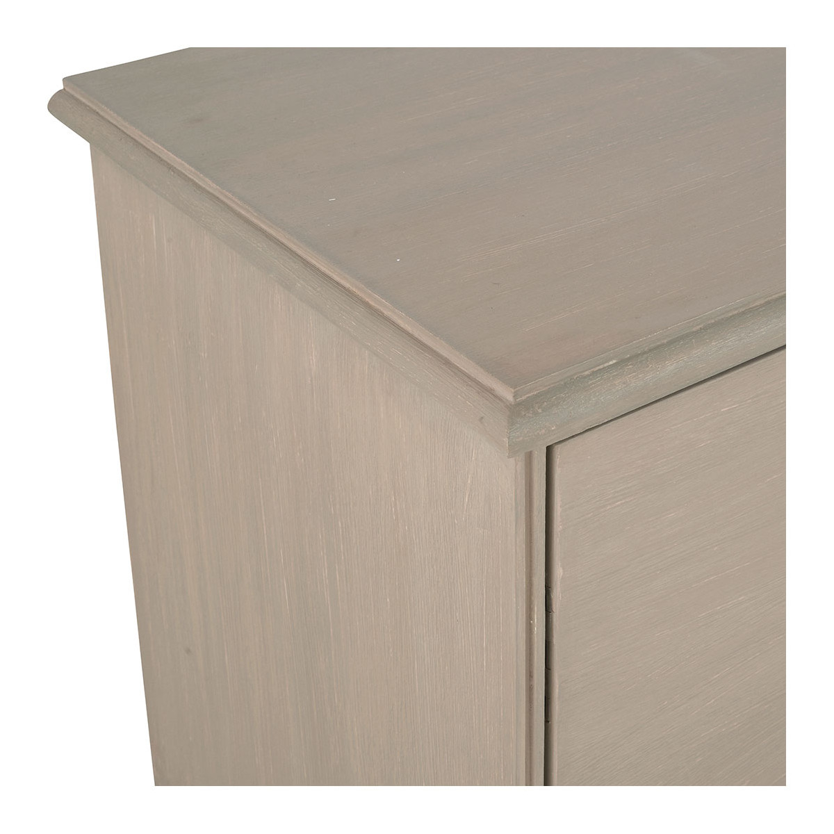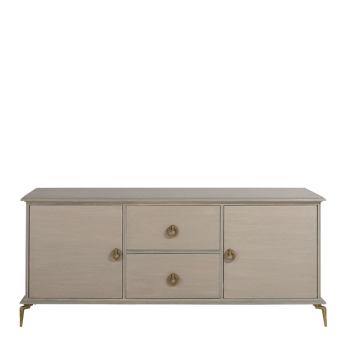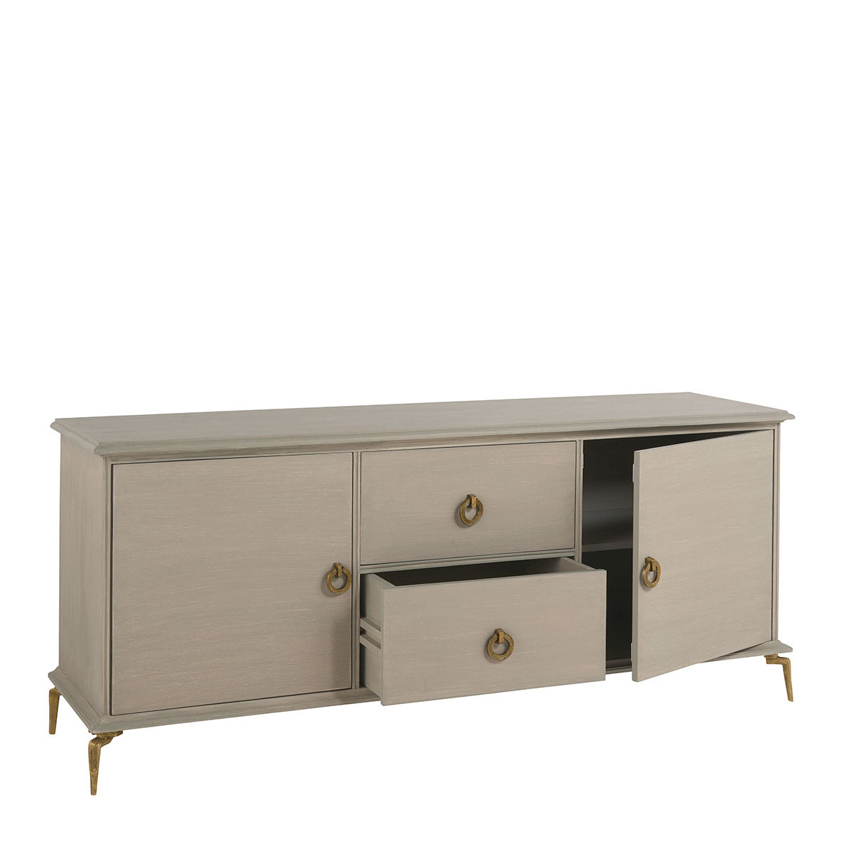 Entirely handcrafted, the classic curves of the GABRIELLE sideboard in mango wood are enhanced by an artisanal gray patina and the luminous brass touches of its feet and handles.