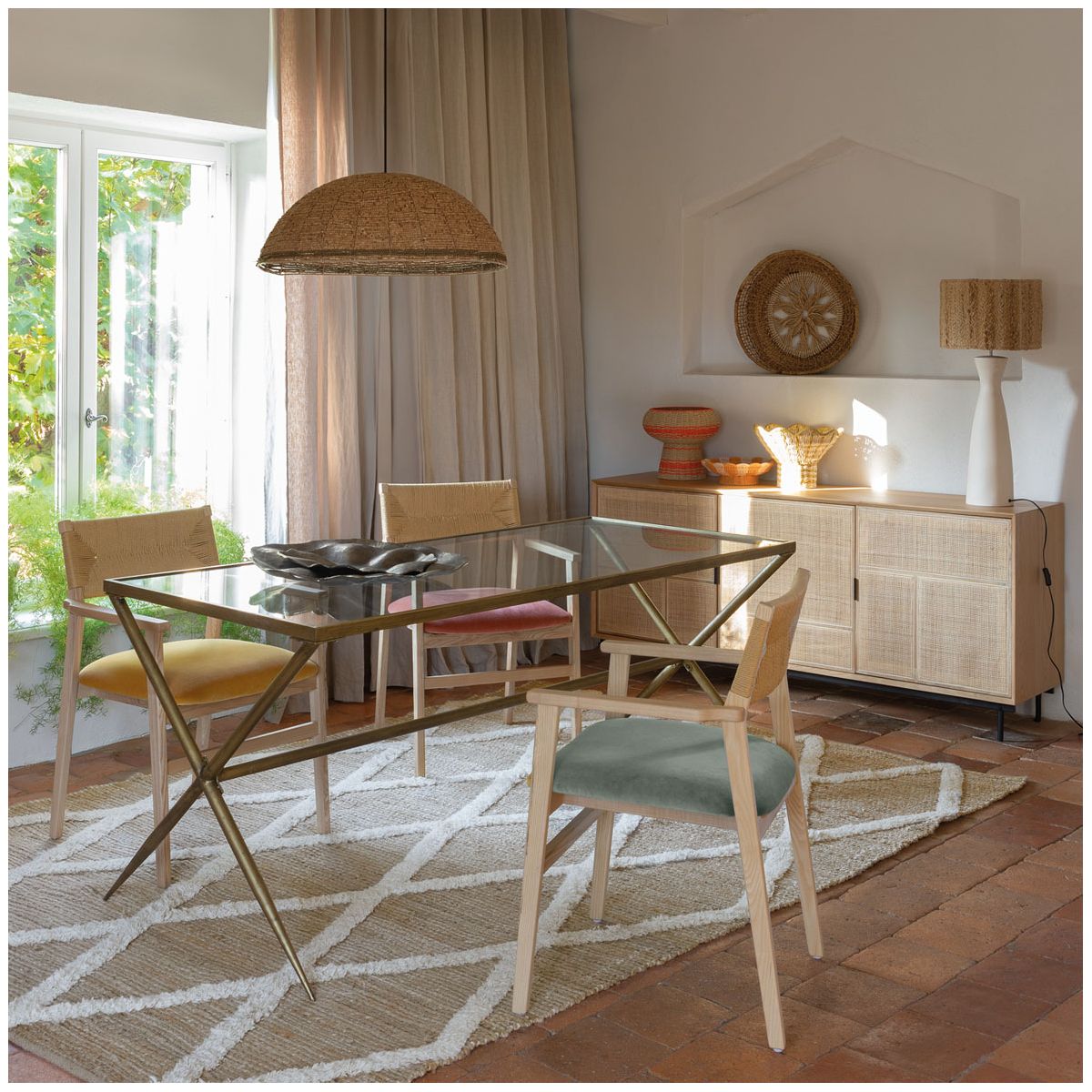 Install it above a solid wood table or kitchen island for a bohemian-chic and luminous effect.