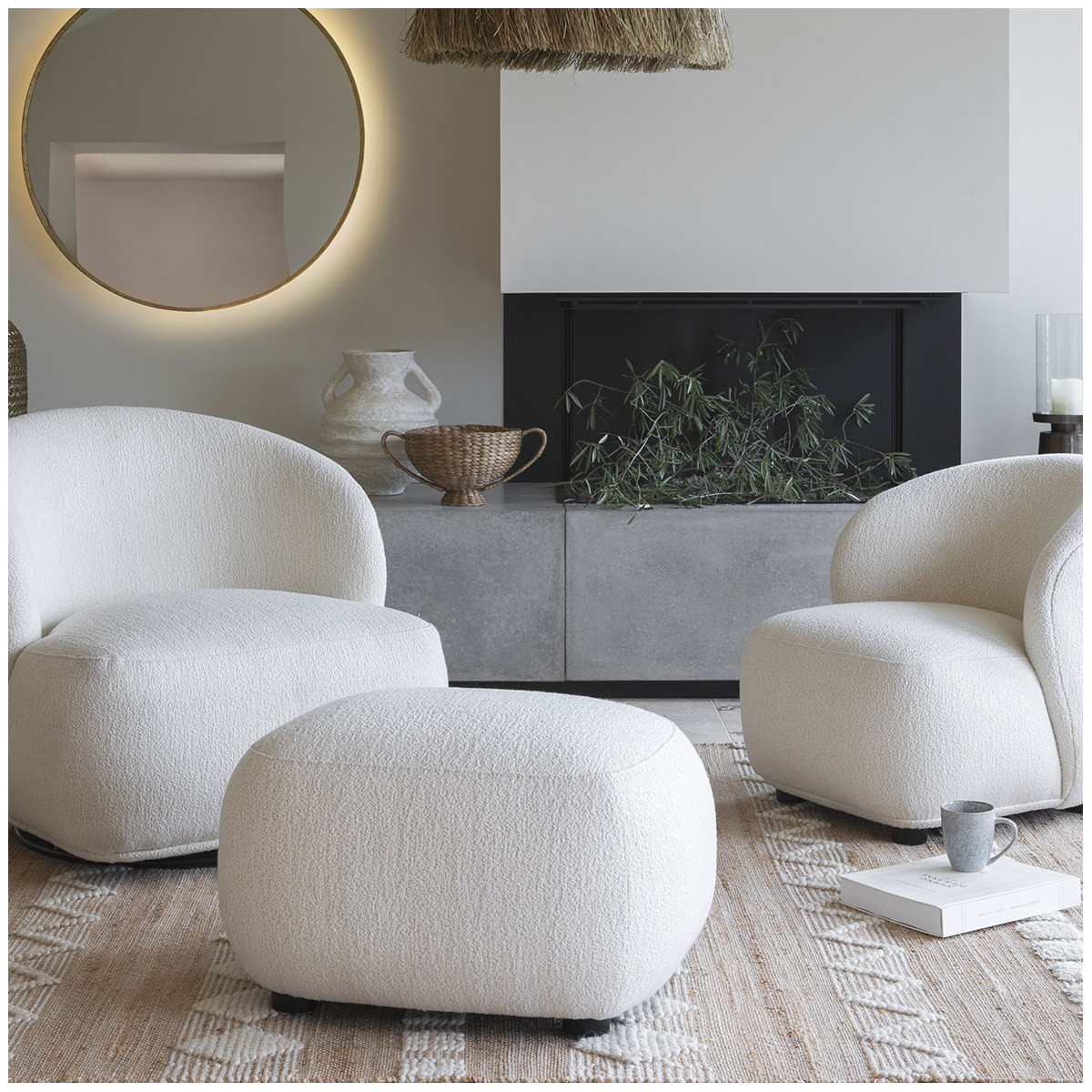 The Blanc d'Ivoire Creative Studio declines the essential bouclé material on a pouf with contemporary lines in the LISETTE range. Elegantly enhance any living space with its chic color and modern shape. Its birch feet ensure sturdiness and stability while being very discreet.