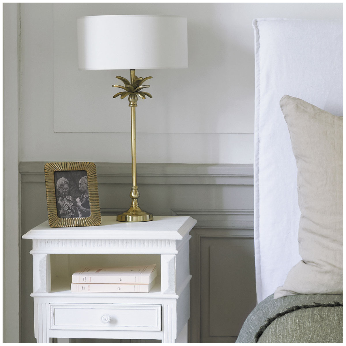 Paired with a Blanc d'Ivoire lampshade, the LUCIE lamp base charms us with its straight lines, detailed craftsmanship and classic palm leaf ornament, which will bring chic and refinement to your bedside tables, desk or sofa side tables.