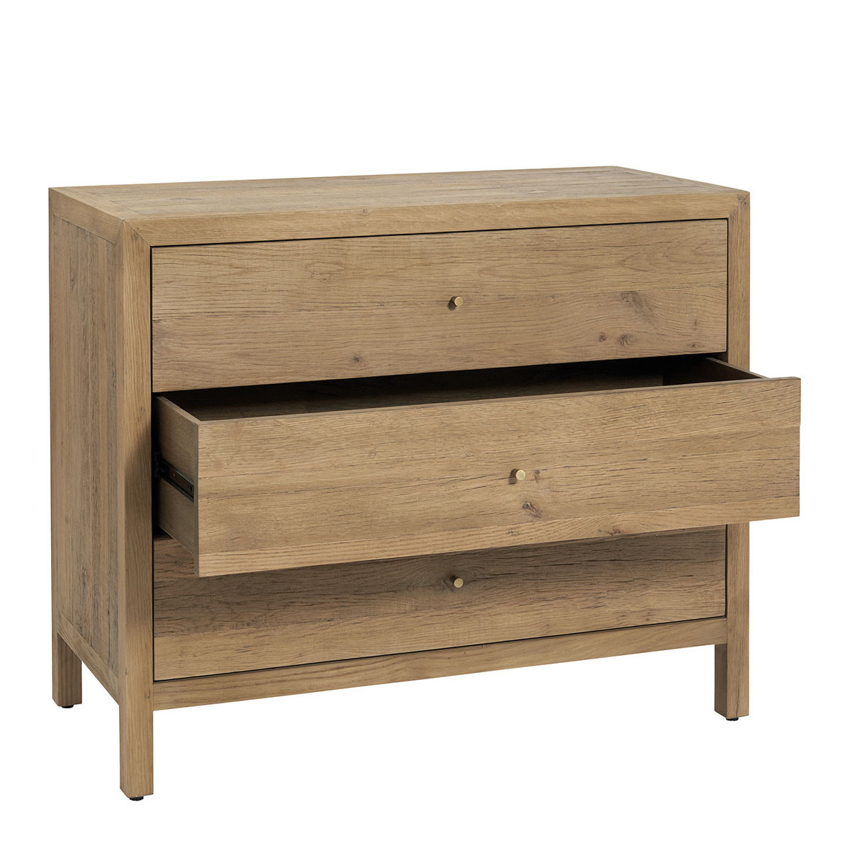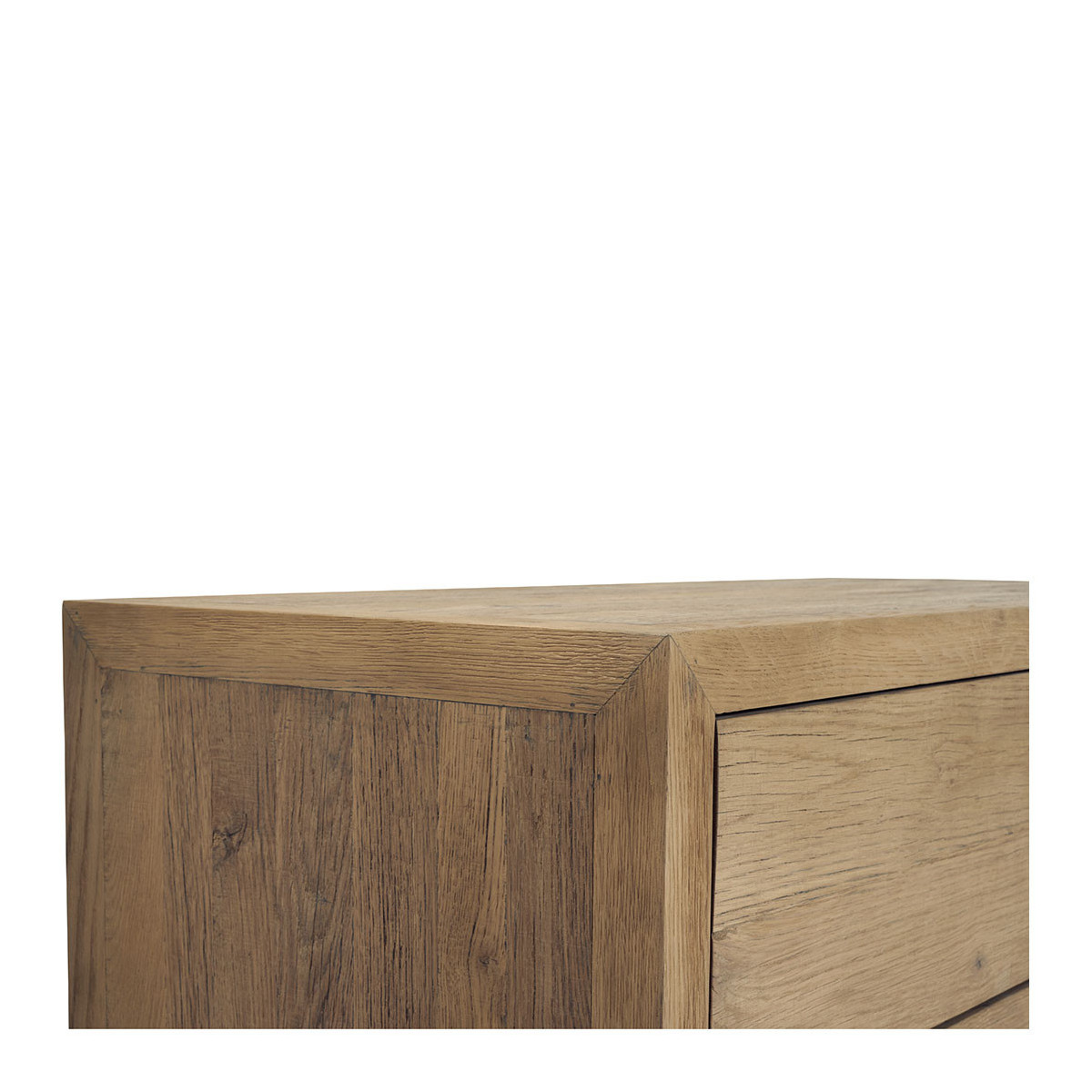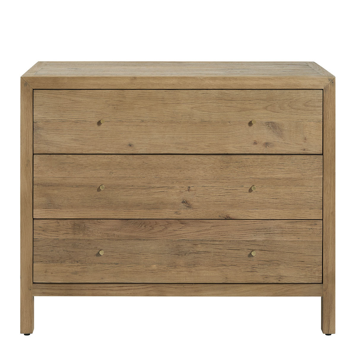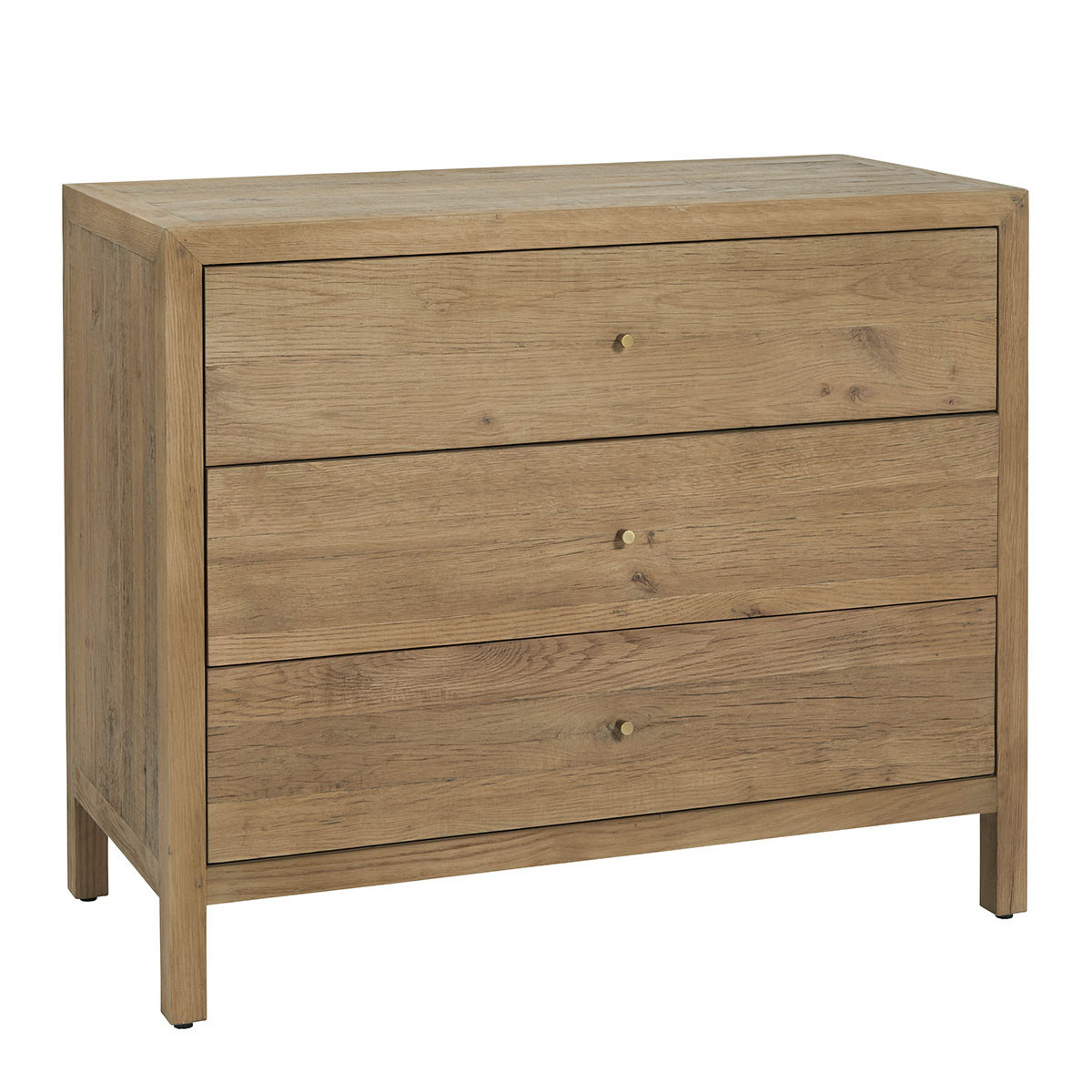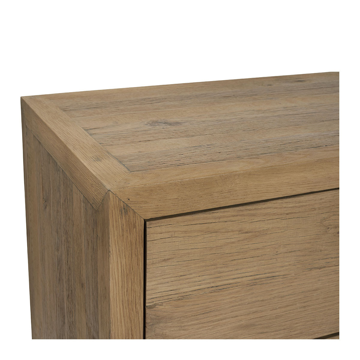 Inspired by the raw charm of country workbenches, the MARCELLE dresser will seduce you with its chic and authentic appearance. Made from recycled light oak, it will bring a warm and elegant touch to your decor. Its natural wood grain and robust construction make it a timeless piece, easy to adopt in all interior styles. Thanks to its three spacious drawers, you'll have ample storage space in your bedroom or living room.