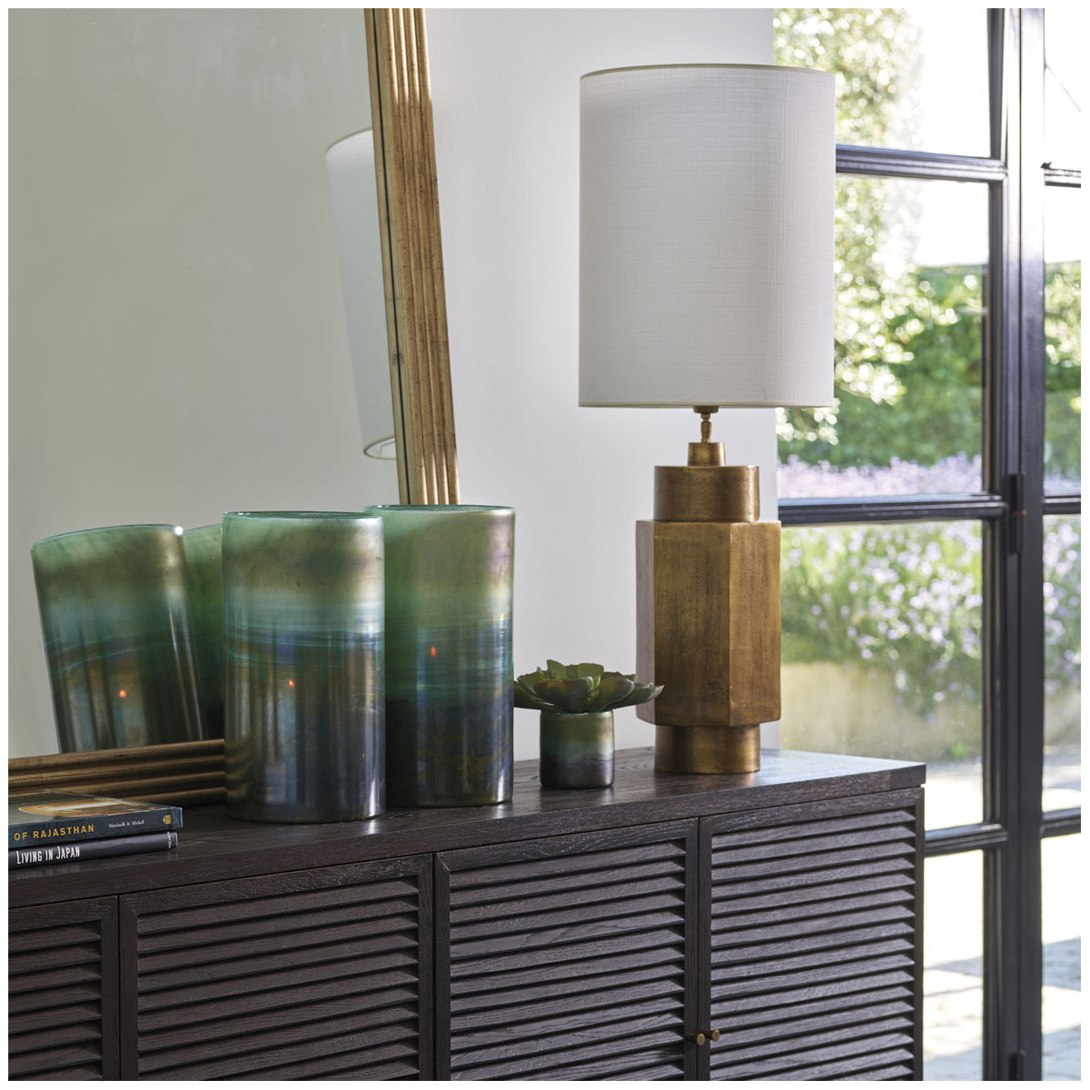 Elegance invites itself into your interior with the magnificent RUNA lamp. Its elegant aged brass base will bring a touch of refinement to a sideboard or side table.