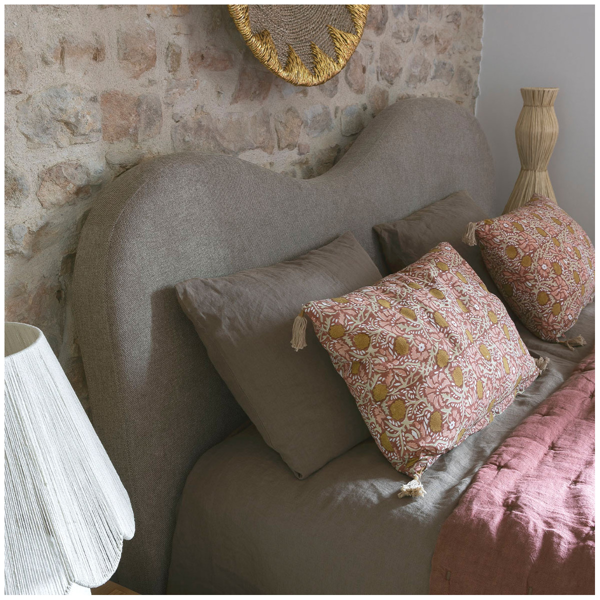 The SÉRÉNA headboard pairs perfectly with linen textiles, neutral-toned cushions, and brass or wooden lighting for a soothing and elegant atmosphere. For an even warmer effect, add a futon and MATTÉO cushion covers in cotton velvet.